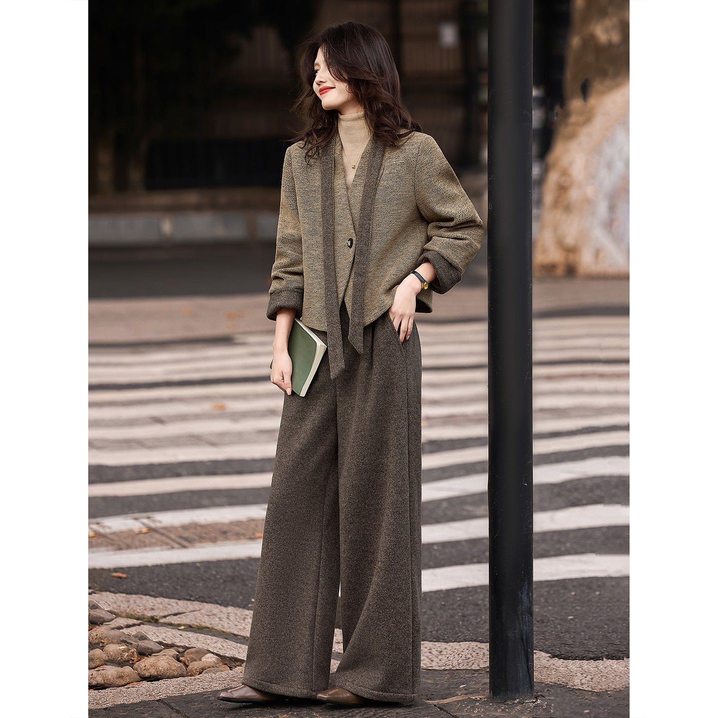 苏醒的乐园加厚V领毛呢外套长裤套装2025年冬季新款女装两件套装