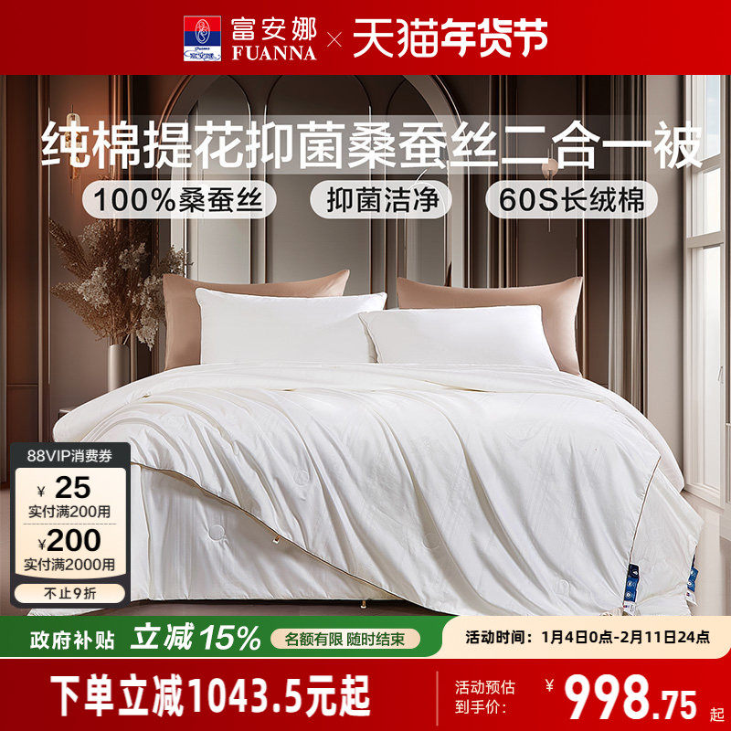 富安娜60S全棉双宫茧桑蚕丝被芯冬厚被春秋被四季被二合一子母被