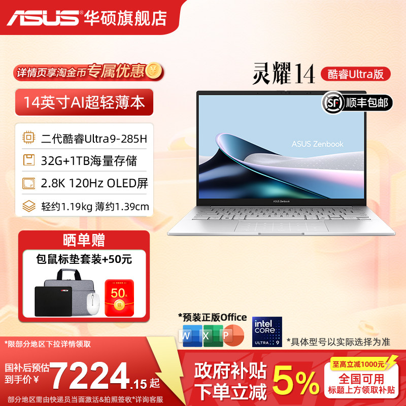 【国补15%】华硕灵耀14 酷睿Ultra9-285H 14英寸2.8K高颜值AI超轻薄商务办公学生设计笔记本电脑