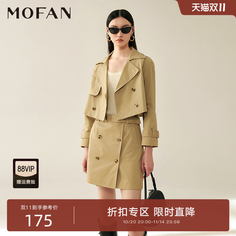 MOFAN摩凡春秋款时尚套装翻领卡其风衣外套短款高腰半身裙两件套