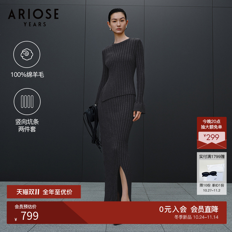 艾诺丝雅诗100%绵羊毛坑条针织衫高腰半身裙两件套装女冬41019203