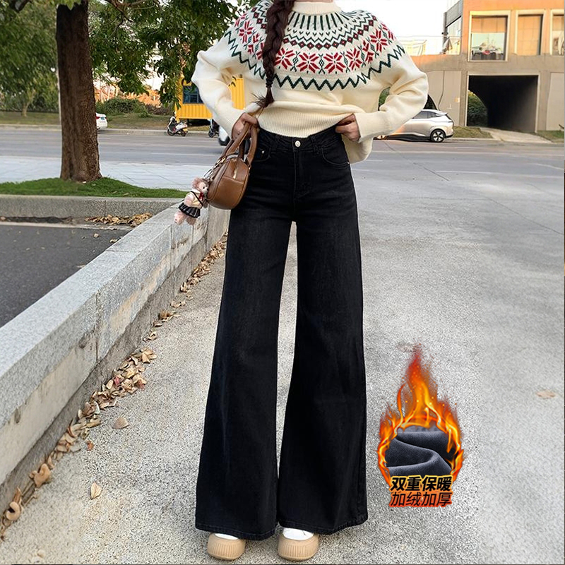 李李服饰加绒黑灰色牛仔裤女2025冬季新款高腰不贴腿显瘦微喇长裤