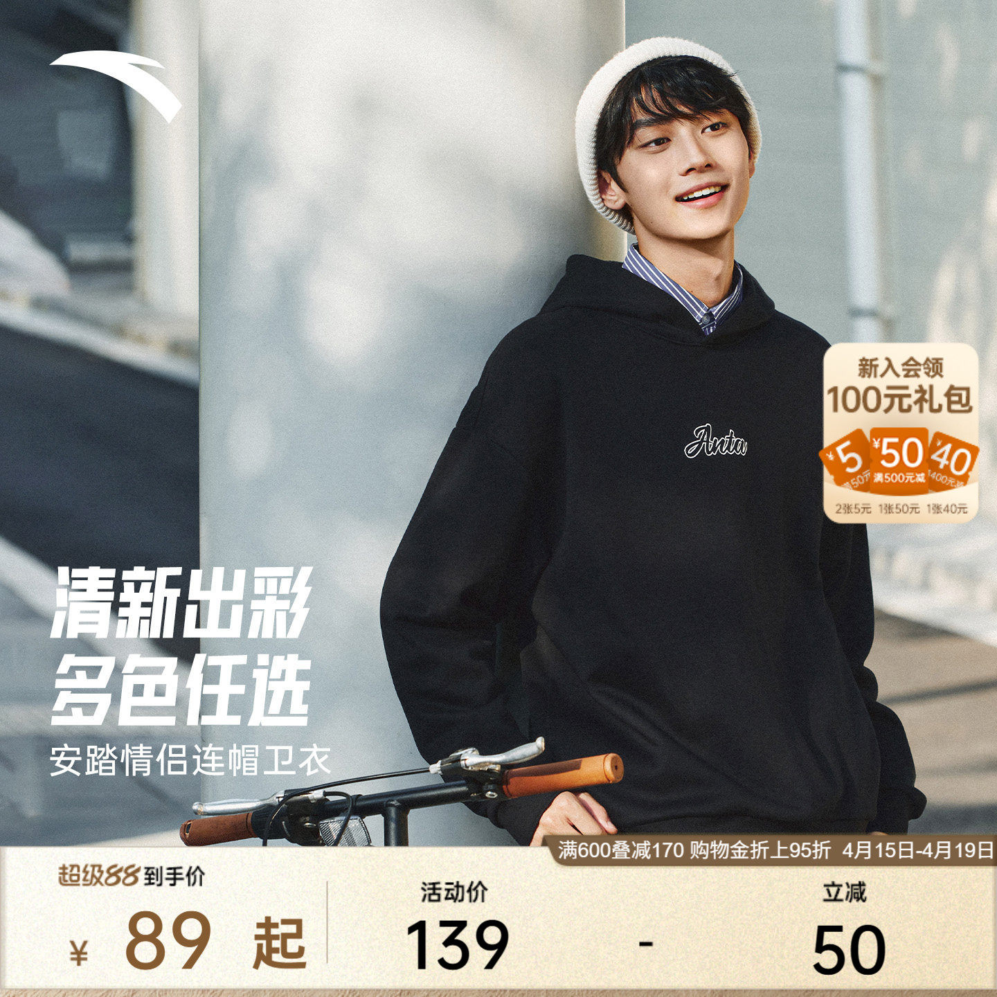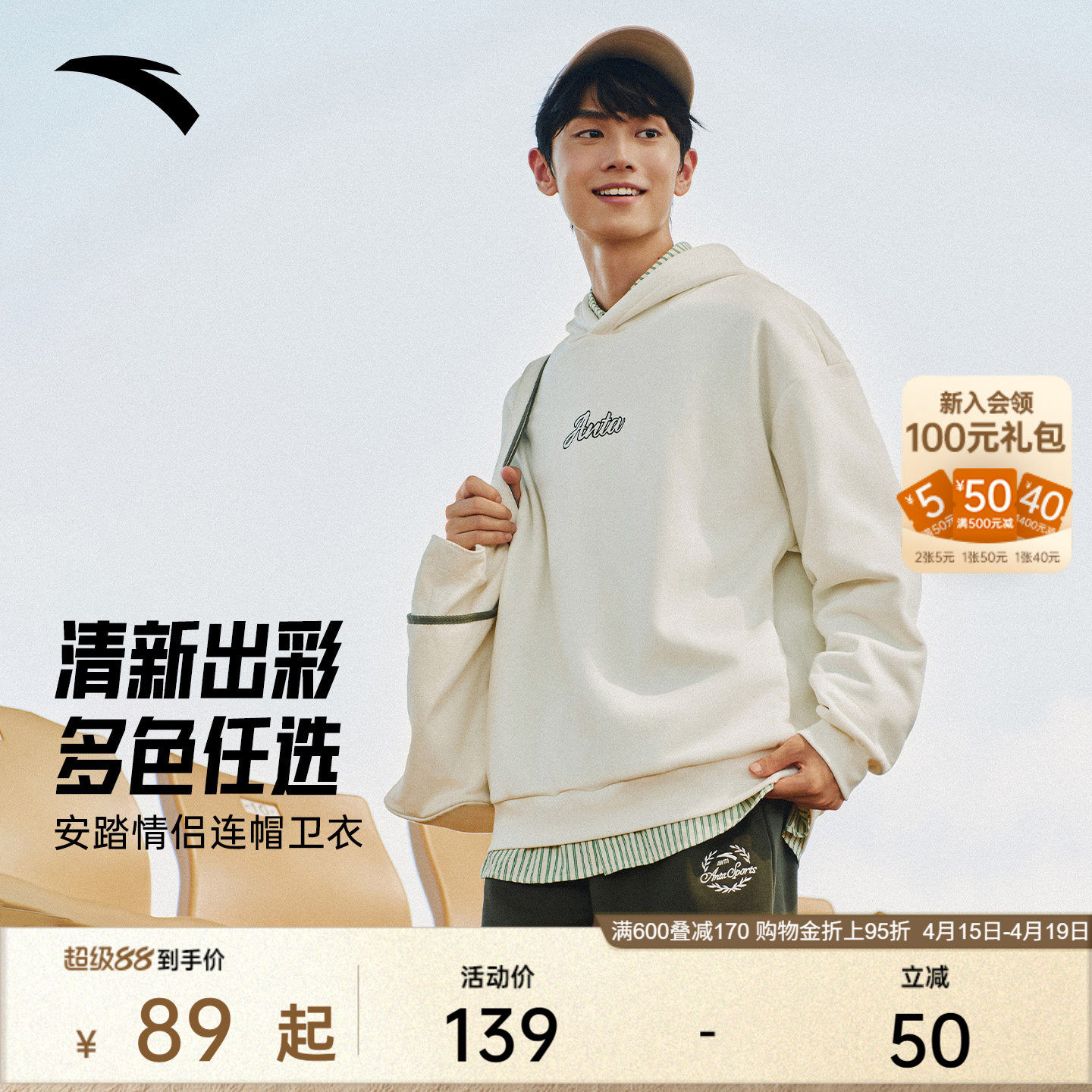 安踏连帽卫衣男女同款春季新款情侣休闲宽松潮流套头长袖针织上衣