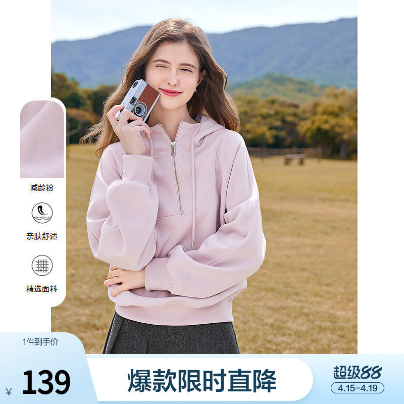betu百图粉色半拉链连帽卫衣女套头2026年春季新款时尚减龄帽衫