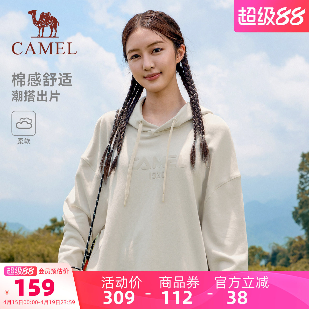 骆驼运动连帽卫衣女2026春季情侣运动套头上衣棉感长袖宽松卫衣男