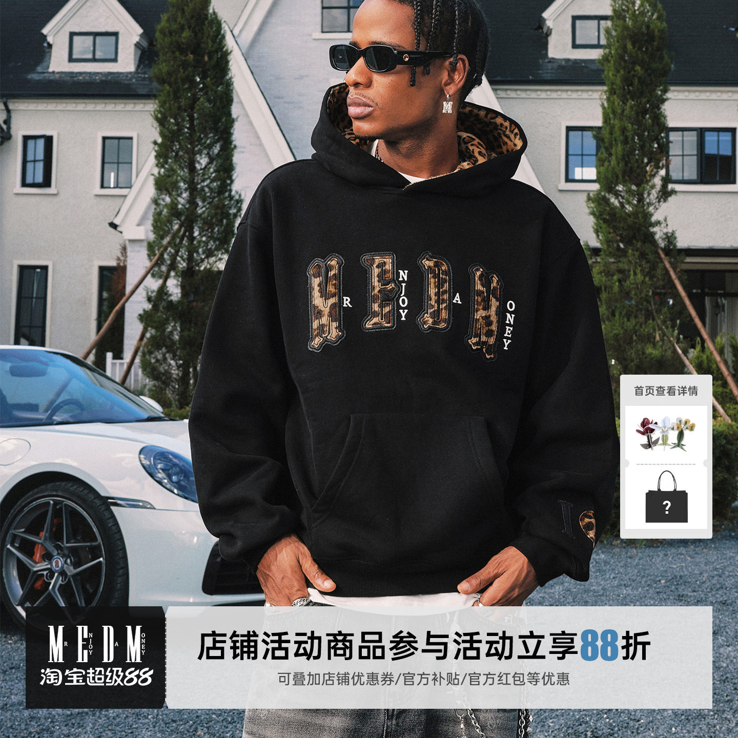 MEDM 帽里豹纹 双层皮毛豹纹休闲连帽卫衣美式套头情侣加绒外套男