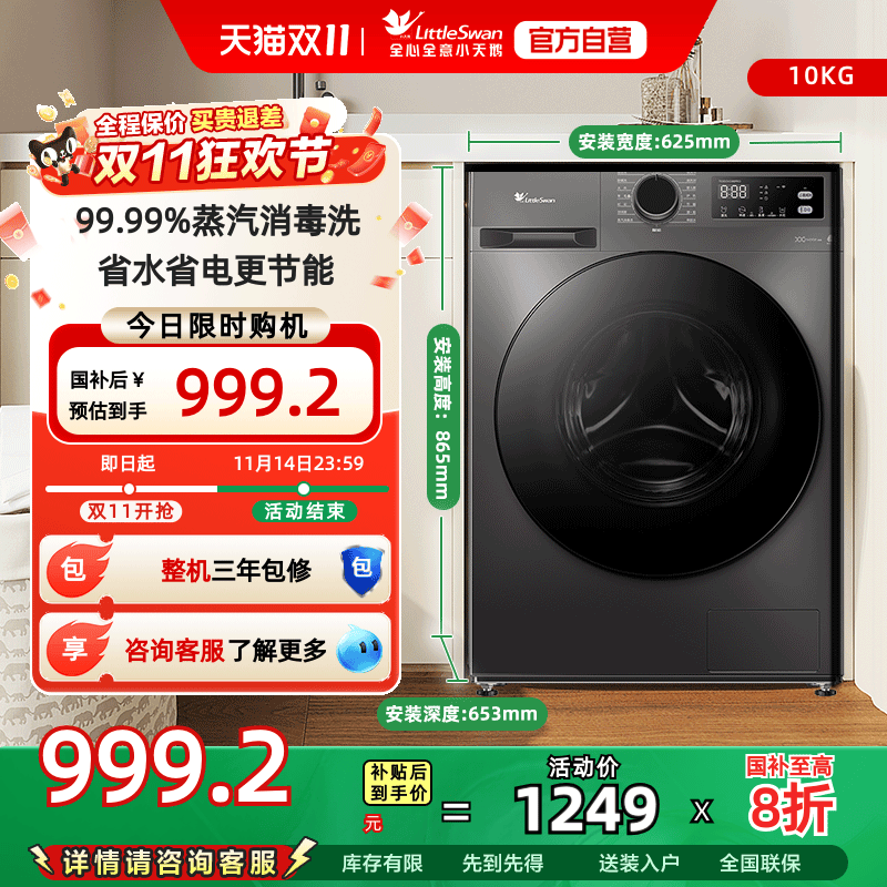 [纯平全嵌]小天鹅10KG小钢炮3超薄家用全自动滚筒洗烘一体洗衣机