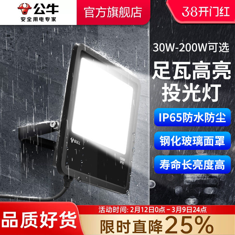 公牛户外防水探照灯超亮照明灯射泛光灯广告灯厂房工地led投光灯