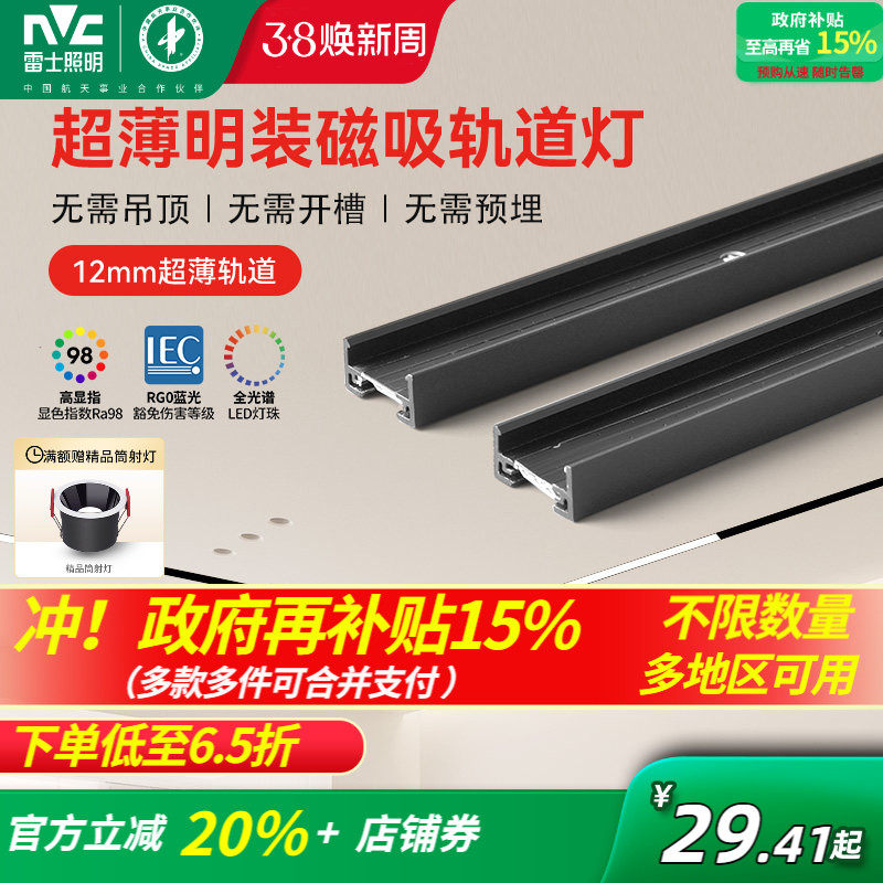 雷士照明超薄明装磁吸轨道灯免吊顶明装客厅泛光灯卧室过道无主灯