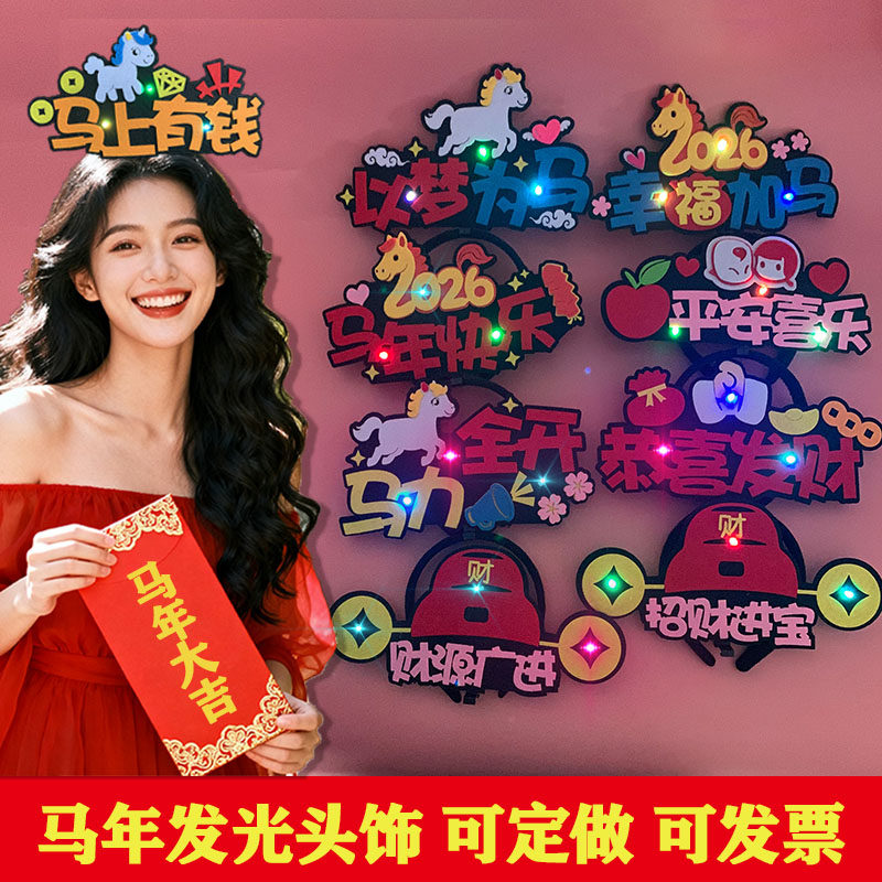 2026马年定制发饰马上有钱发光头饰公司年会活动彩灯装饰发箍发卡