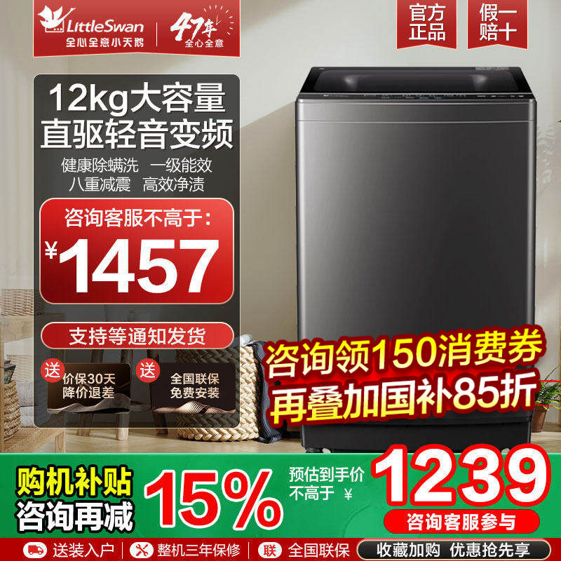 小天鹅12公斤大容量洗衣机全自动家用直驱变频除菌波轮官方旗舰店