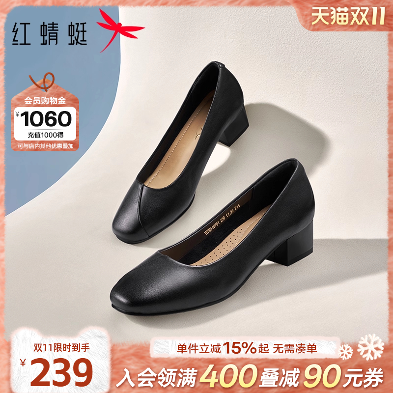 红蜻蜓粗跟单鞋女真皮面试工作女鞋不累脚妈妈高跟鞋黑色职业皮鞋