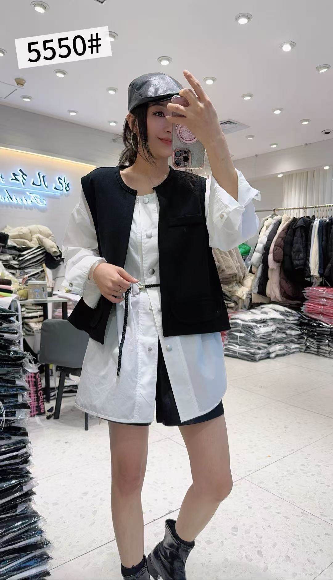 妃儿红5550春加大码衬衫女 韩版拼色马甲假两件宽松遮肚休闲衬衫