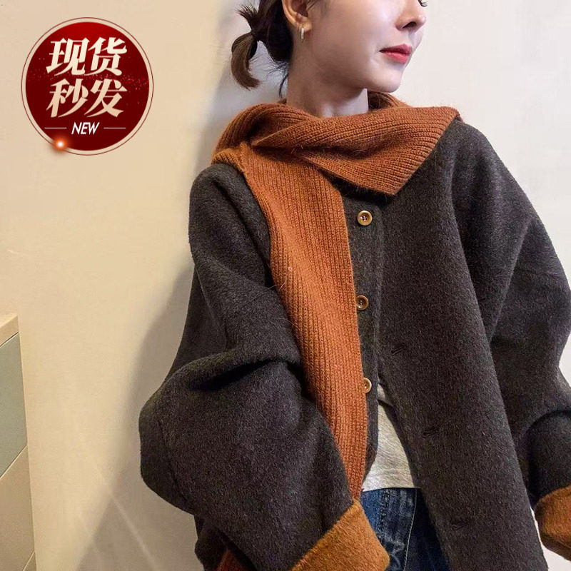 欧洲站狐狸毛围巾双面羊毛呢子大衣外套女中长款撞色宽松2025冬季