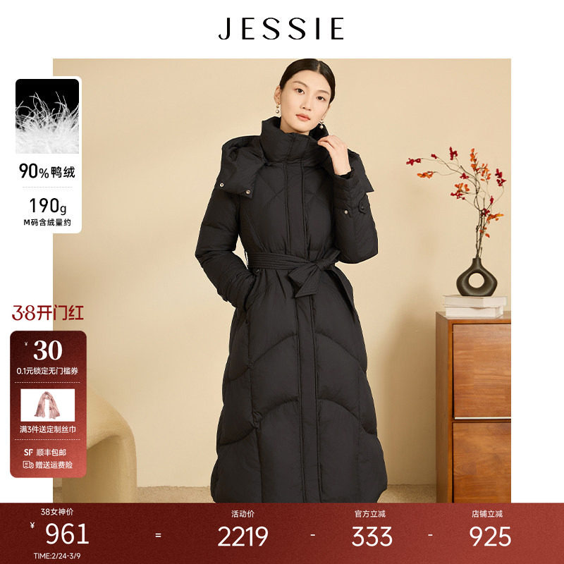 JESSIE黑色中长款系带连帽羽绒服女冬季新款保暖加厚外套大衣