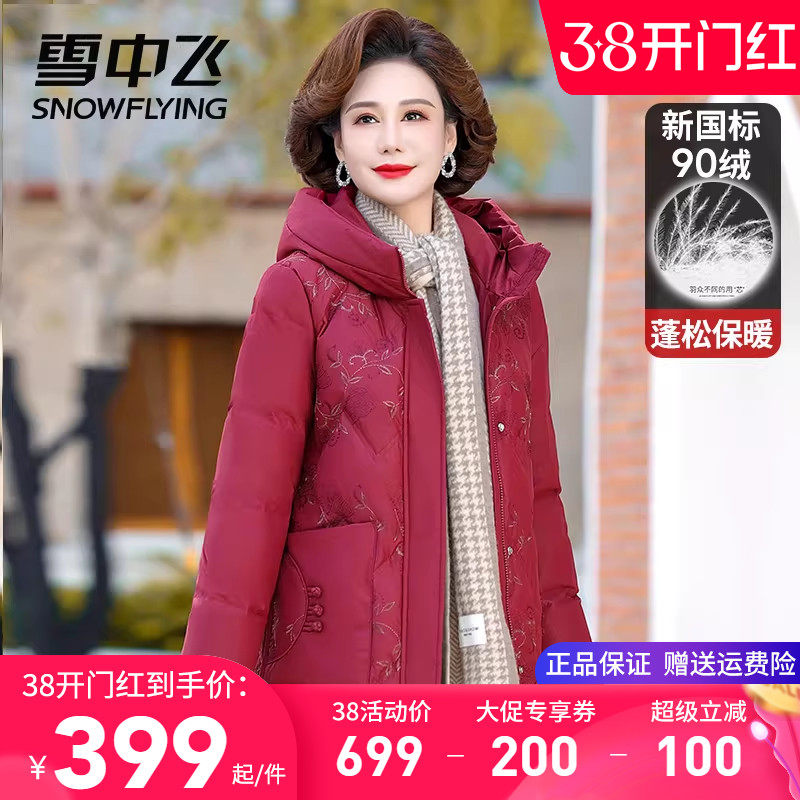 雪中飞妈妈中长款羽绒服女冬装超好看金线刺绣花加厚加大连帽大衣