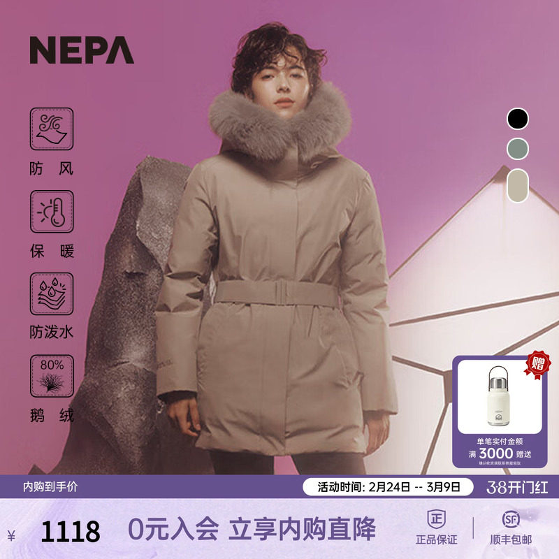 NEPA耐葩户外秋冬季女士大衣式中长款连帽GTX鹅绒羽绒服女7I82056