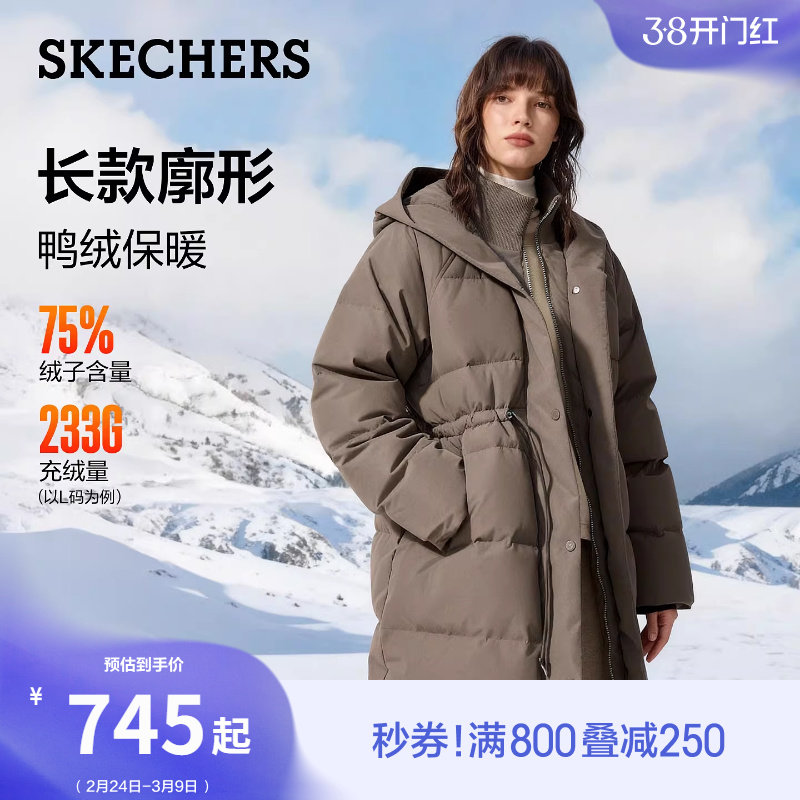 斯凯奇中长款羽绒服厚外套女冬季防风防泼水保暖收腰大衣时尚舒适