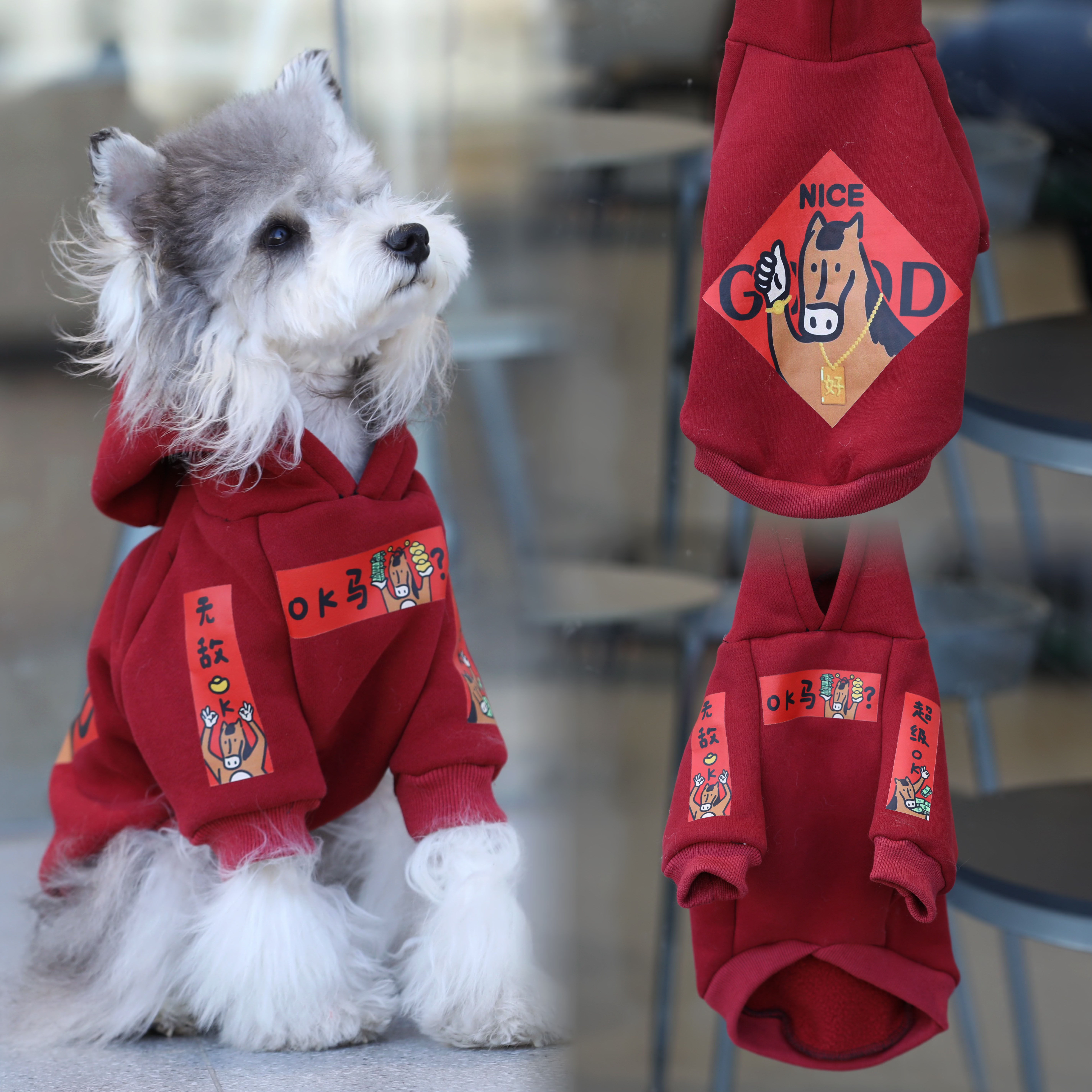 宠物猫狗衣服 秋冬保暖酒红马年喜庆新年卫衣 中小大型犬雪纳瑞衣