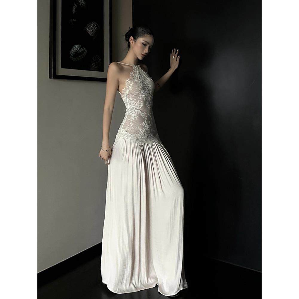蕾丝拼接性感露背吊带连衣裙女夏季修身收腰裙子纯欲气质a字长裙