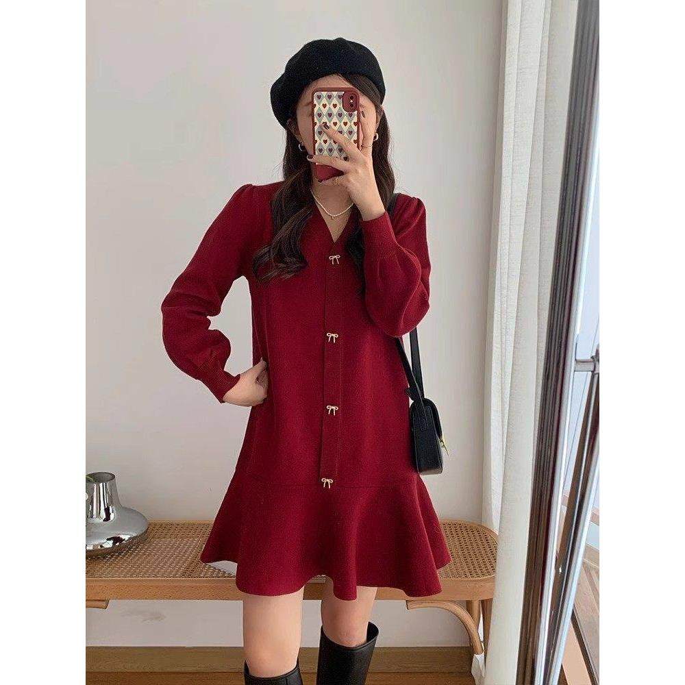 法式气质荷叶边针织连衣裙女2024冬季新款V领内搭红色宽松毛衣裙