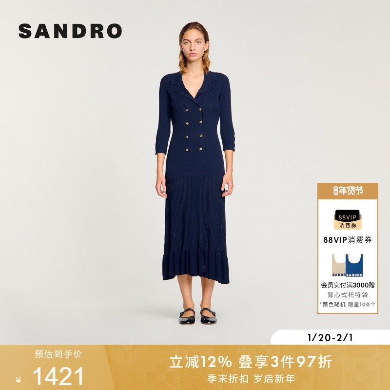SANDRO2025秋冬女装气质优雅深蓝色V领双排扣荷叶边针织连衣裙