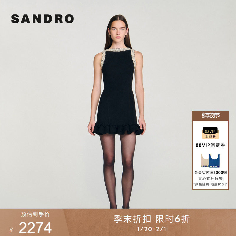 季末6折SANDRO2025秋冬新款女装黑色仿珠饰荷叶边下摆针织连衣裙