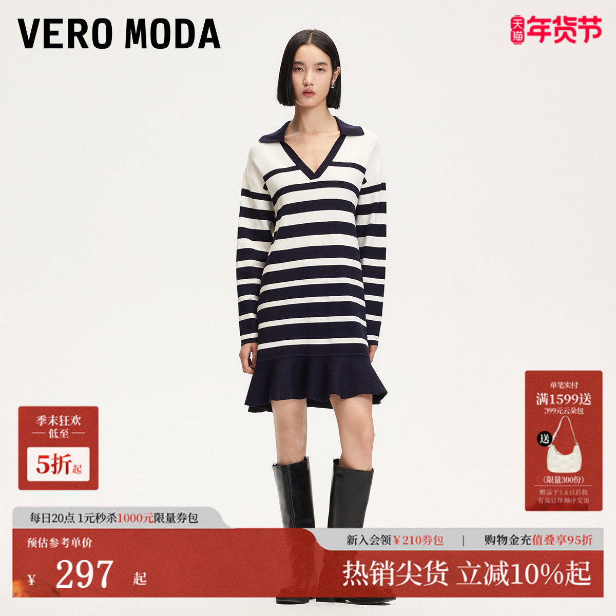 Vero Moda连衣裙女2025夏季新款航海条纹V领荷叶边学院风针织