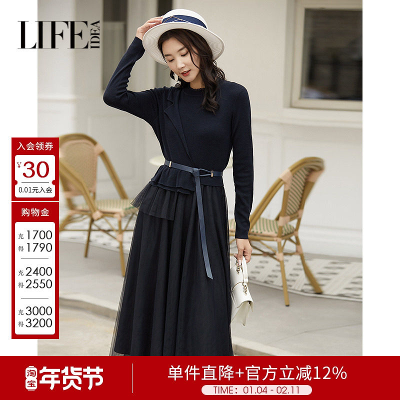 莱芙艾迪儿优雅通勤精致女人味荷叶边设计感针织网纱拼接连衣裙女