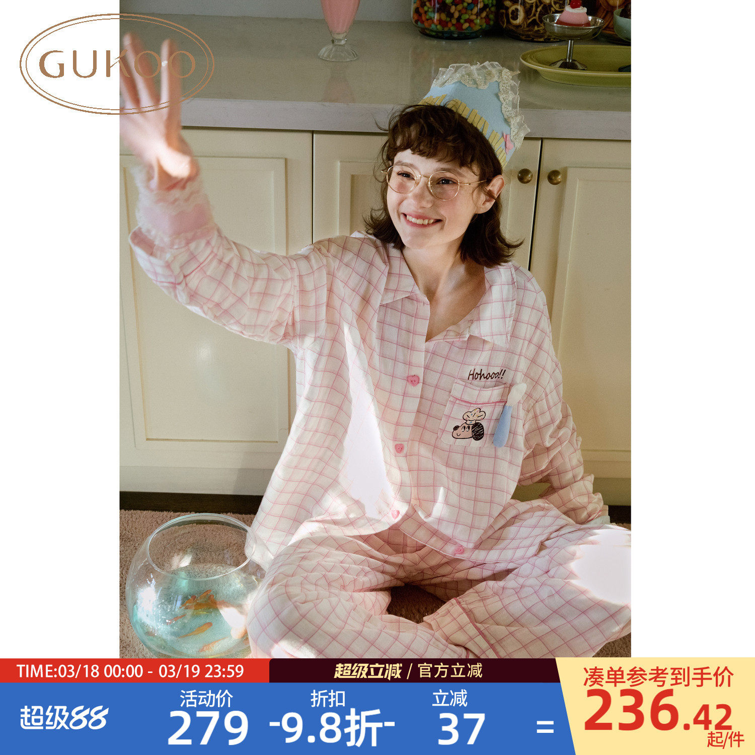 Gukoo/果壳长袖睡衣女春夏轰轰小狗新款纯棉格子女士家居服套装A
