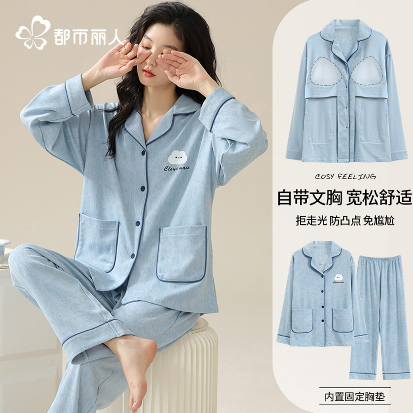 都市丽人纯棉睡衣女春夏秋款带胸垫长袖套装2026新款家居服可外穿