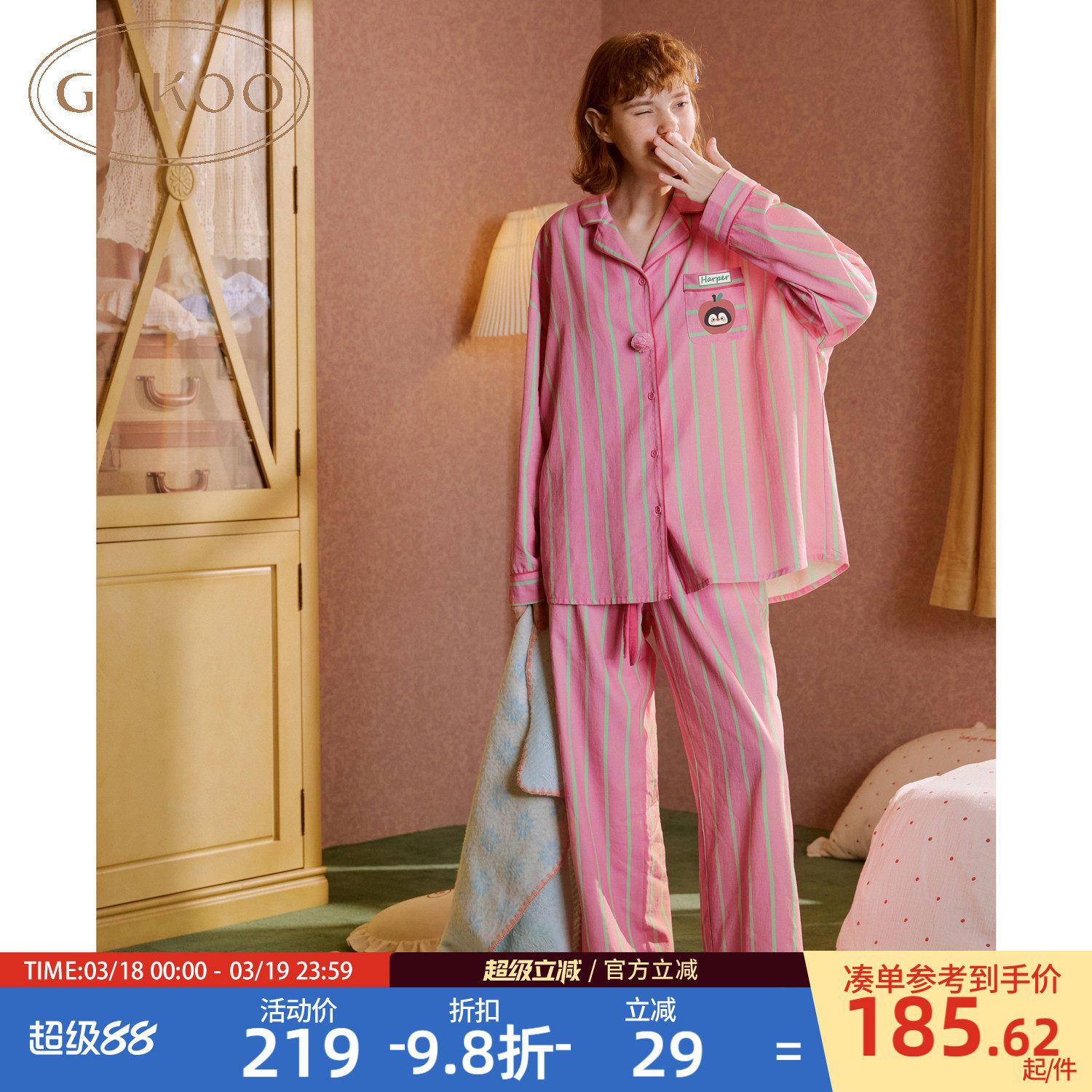 Gukoo/果壳长袖睡衣春夏小企鹅印花新款条纹女士家居服套装A