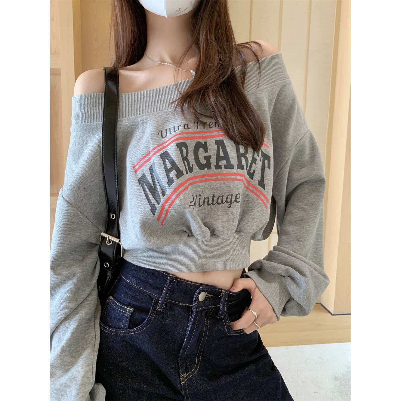ELOF6081# 实拍 实价 华棉复合 2026春装卫衣女斜肩一字领露肩