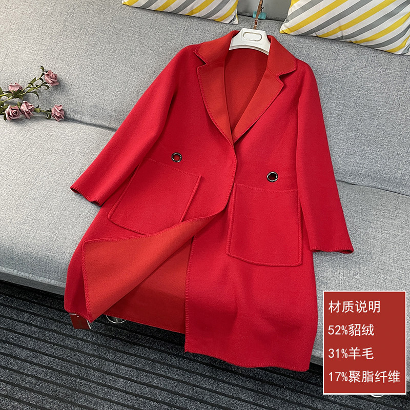 秋冬双面羊绒大衣女短款小个子双排扣毛呢外套安哥拉红西装领羊毛