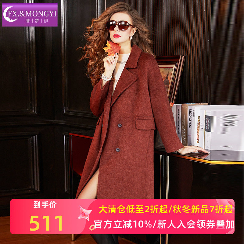 菲梦伊粉色西装领羊毛大衣女秋冬季加厚保暖双排扣中长款毛呢外套