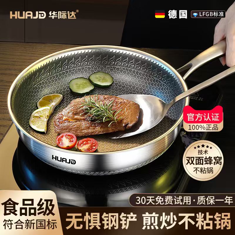 华际达食品级不锈钢煎锅平底锅煎牛排煎蛋饼早餐不粘炒菜锅燃气灶