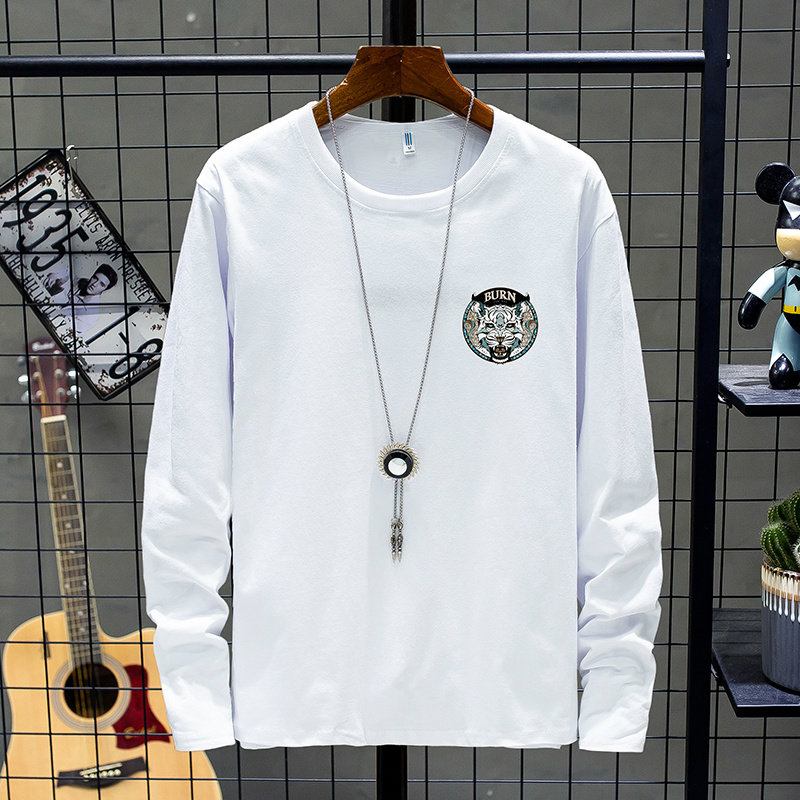 男士长袖t恤潮流男装秋季体恤纯棉印花潮牌秋衣打底衫白色上衣服