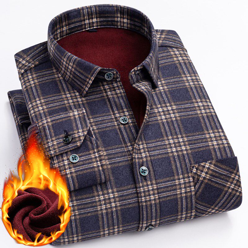 秋冬季男士保暖衬衫加绒加厚款长袖修身潮格子男装父亲老人花衬衣