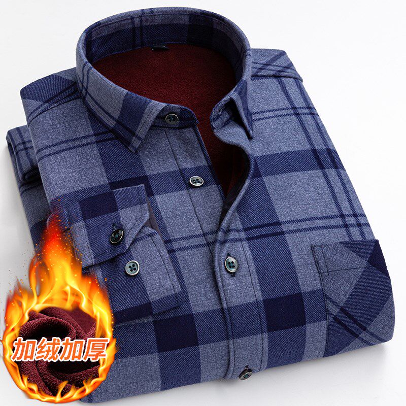 中年爸爸装保暖衬衫男长袖加绒加厚中老年厚实秋冬季大码父亲衬衣
