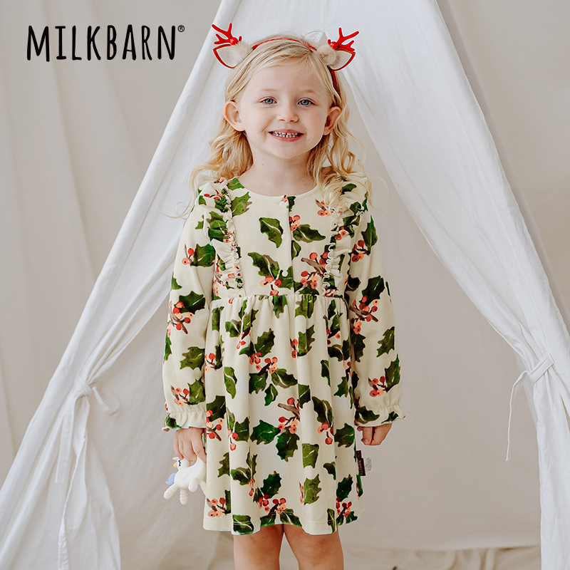 Milkbarn儿童荷叶边连衣裙女宝宝圣诞公主裙女童秋冬裙子
