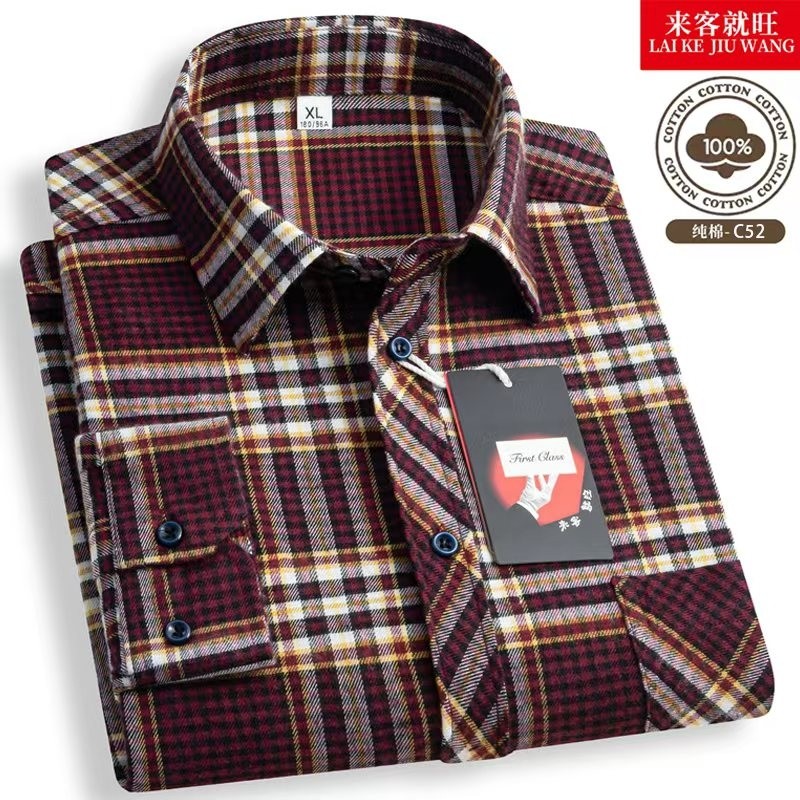 新款全棉长袖格子衬衫男中老年爸爸装加大码磨毛纯棉衬衣直摆宽松