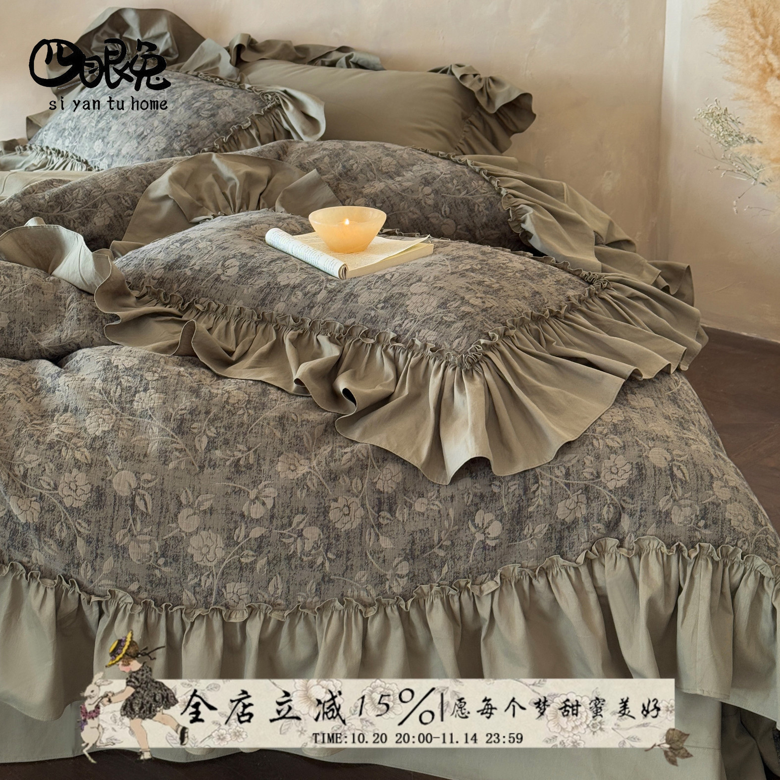 琼花漫野︱法式复古全棉印花四件套纯棉斜纹褶皱花边被套床单床品