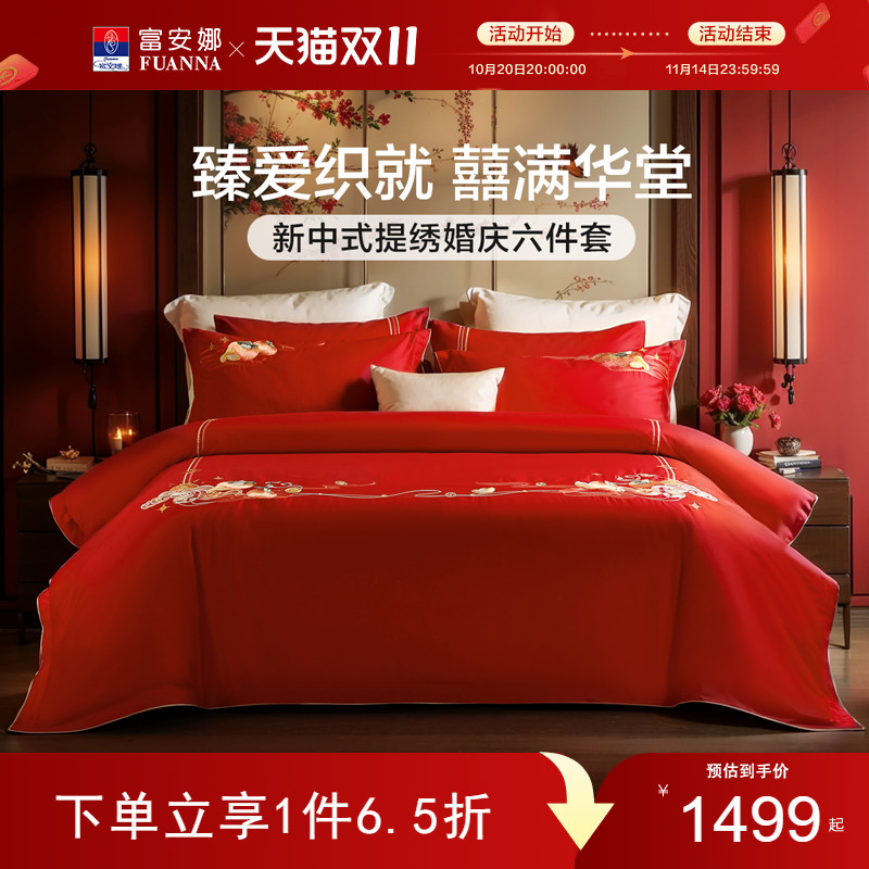 富安娜60支长绒棉婚庆四件套结婚床品婚嫁纯棉六件套床上用品新品