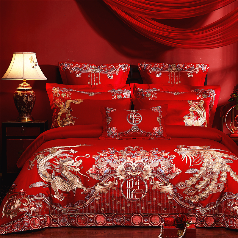 高档龙凤刺绣婚庆四件套大红色新婚陪嫁被套床单结婚房床品六件套