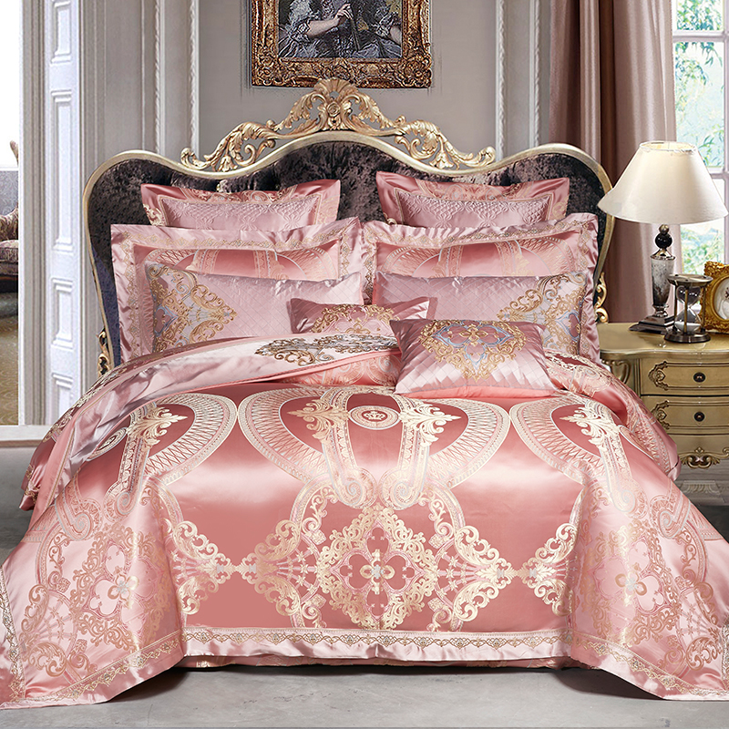高档欧式贡缎提花床上用品四件套奢华粉色婚庆床盖六八十件套床品