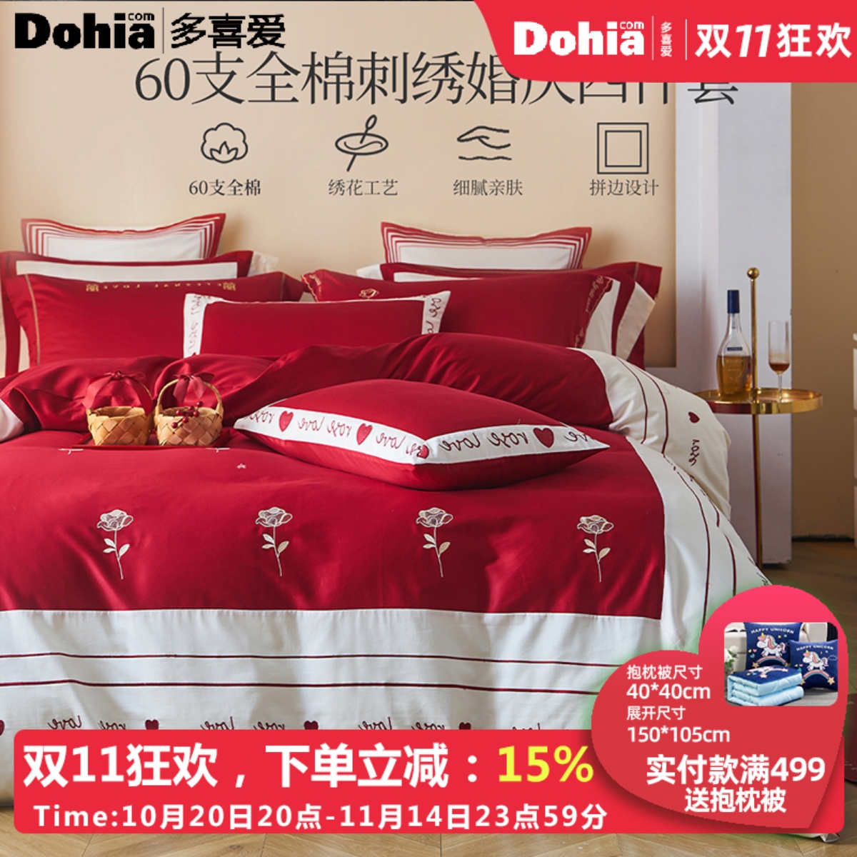 多喜爱60支全棉四件套婚庆结婚喜被床上用品婚嫁六件套床品被套