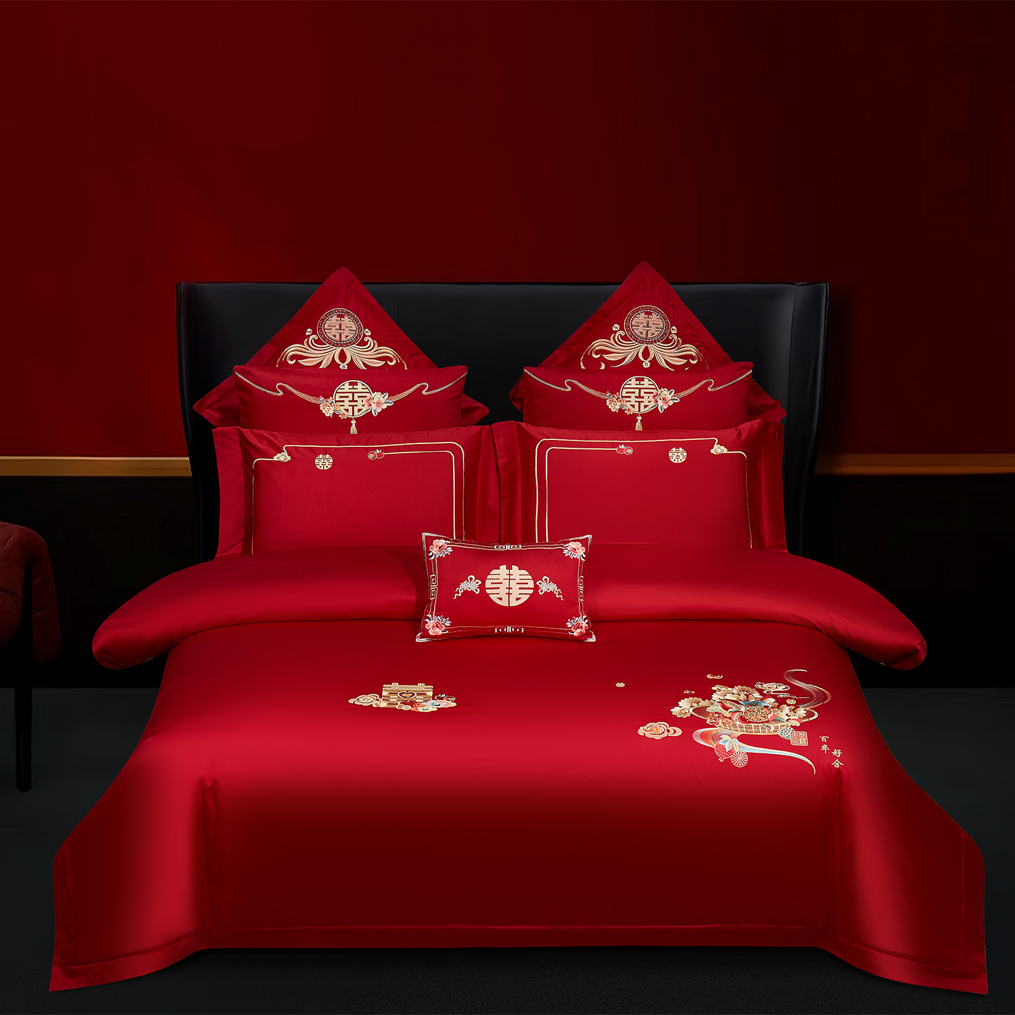 中式婚庆100全棉四件套刺绣大红色床上六件套高级感结婚纯棉床品