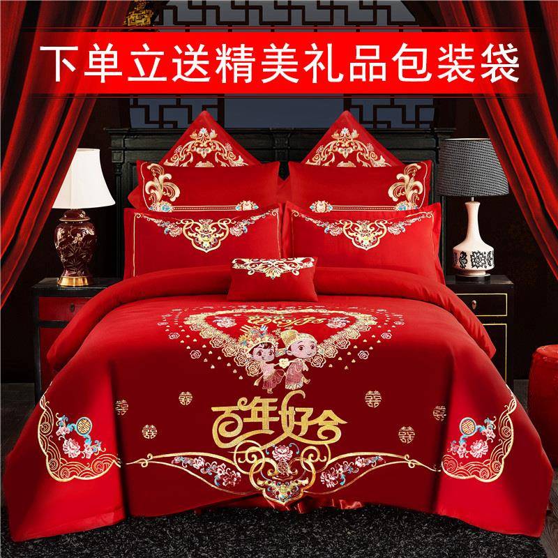 全棉新婚庆简约刺绣四件套纯棉大红色六八件套新婚房结婚床上用品