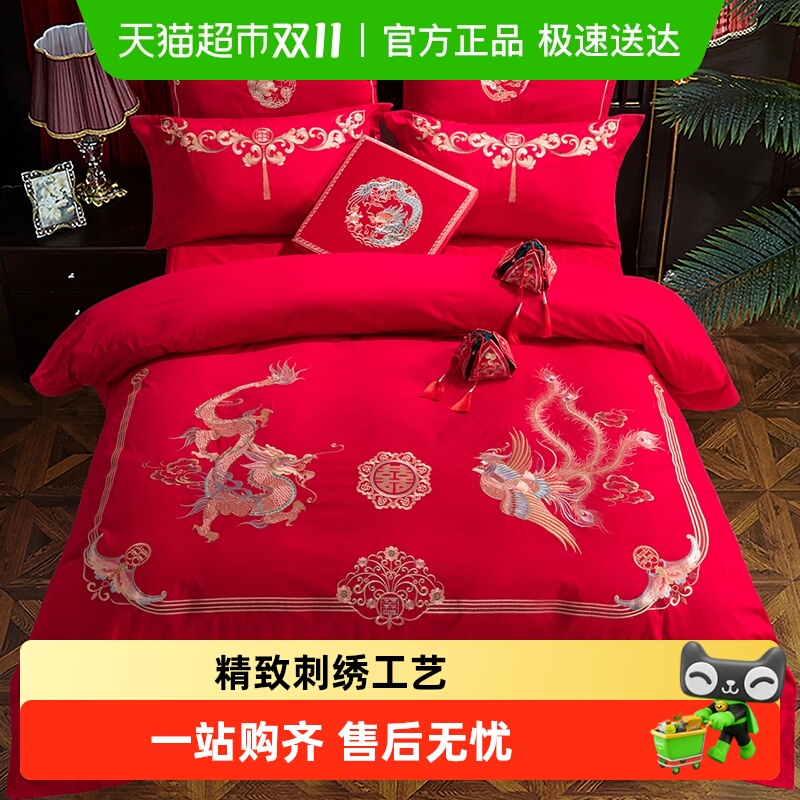 新婚庆四件套大红全棉刺绣结婚房嫁喜被龙凤纯棉六十件套床上用品