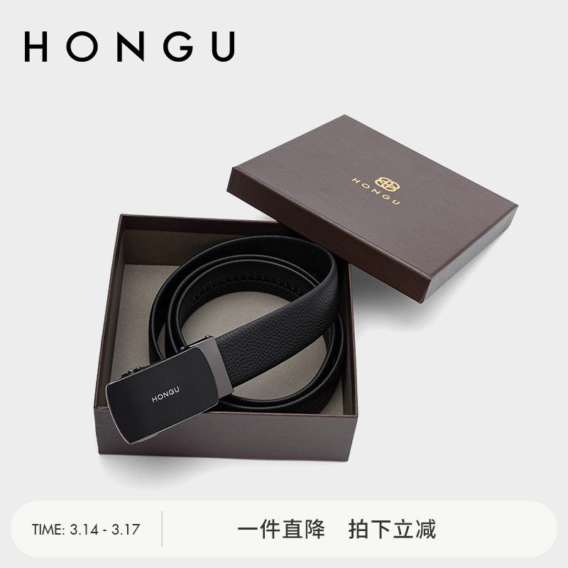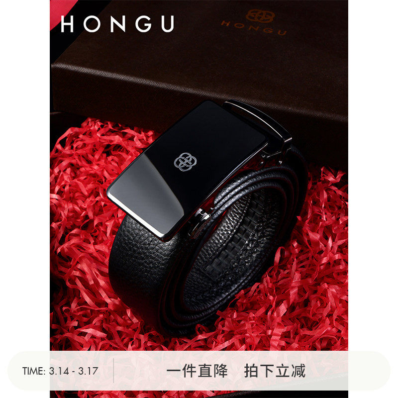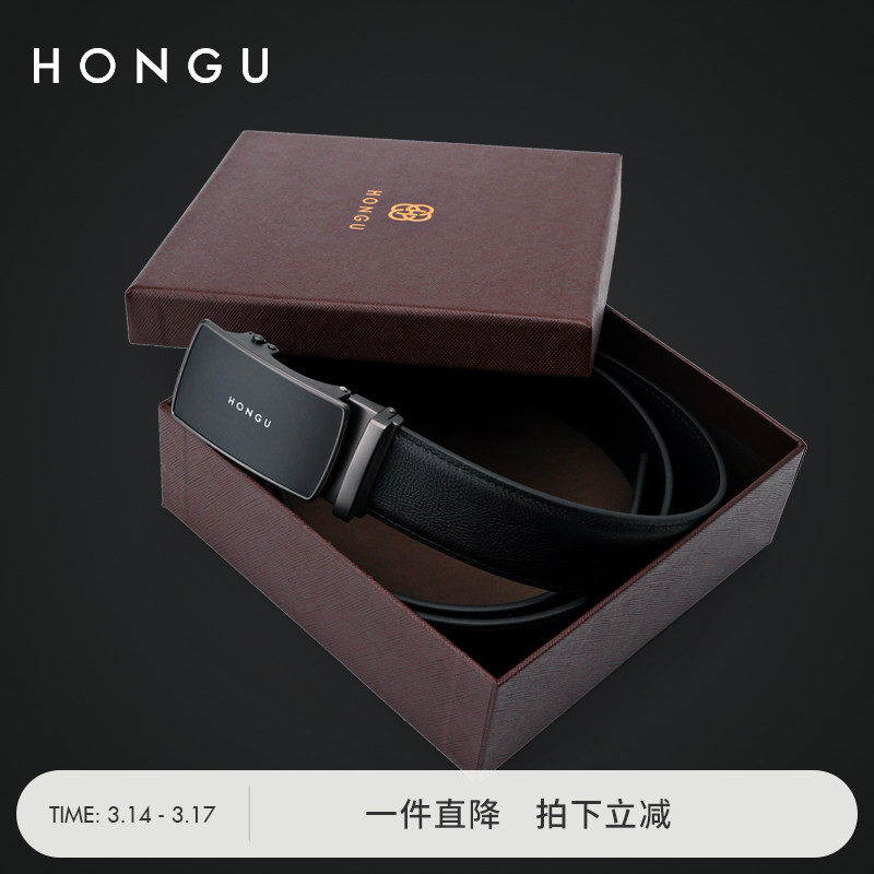 红谷新款男士头层牛皮腰带休闲商务自动扣裤带时尚真皮礼盒款皮带